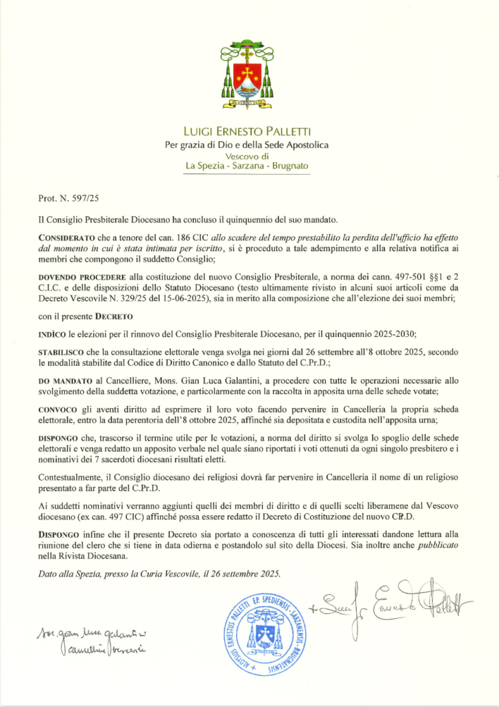 Decreto di indizione delle elezioni per il rinnovo del Consiglio Presbiterale Diocesano, per il quinquennio 2025-2030