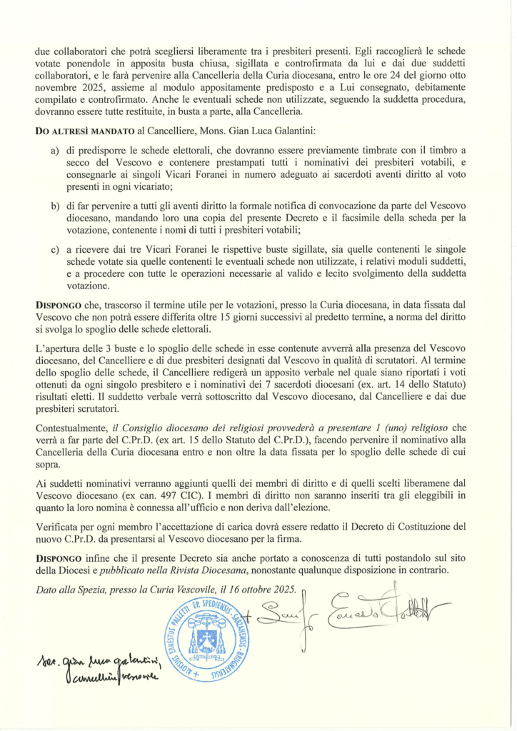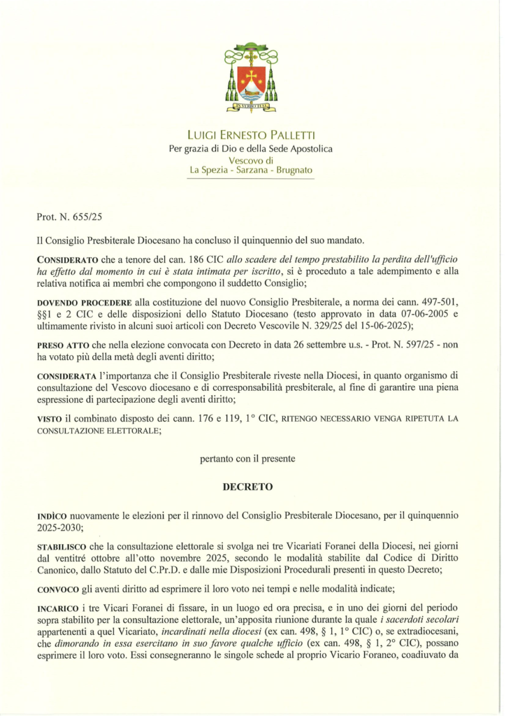 Nuovo Decreto di indizione delle elezioni per il rinnovo del Consiglio Presbiterale Diocesano, per il quinquennio 2025-2030